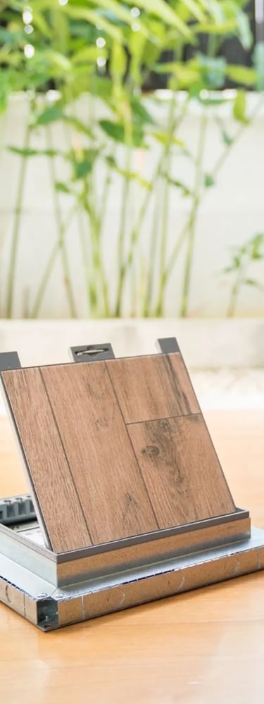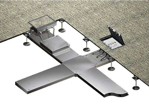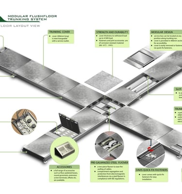 A Modular Flushfloor Trunking with a comprehensive range of accessories including vertical access box, end cap and reducer.